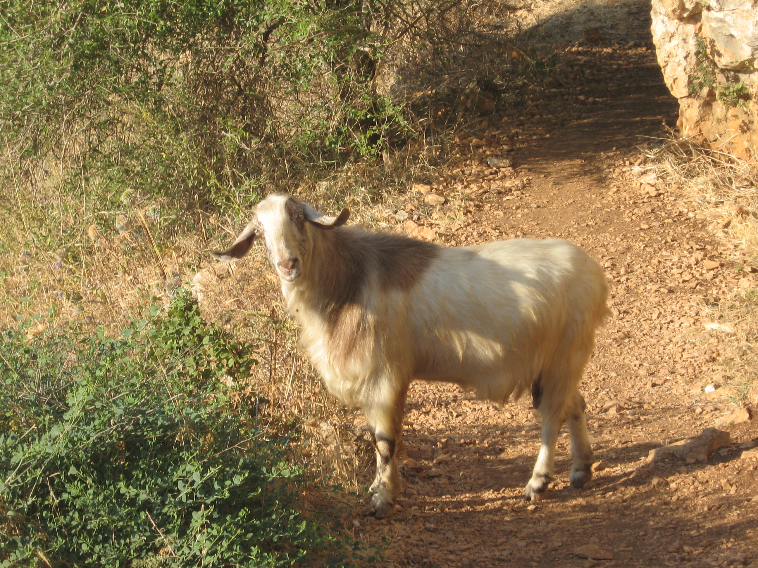 | A goat near the base of Arbel with the Sea of Galilee in the background |