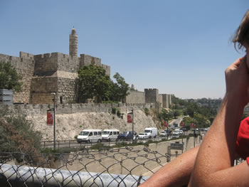 The west wall of the city. The citidel is on the other side of the wall. This was always the location of the fortress that defended the northern end of the western ridge. The cars are driving up a road that follows the Hinnom Valley on the west side of Jerusalem.