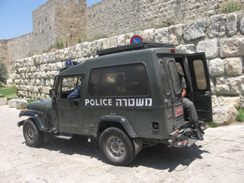 | A police vehicle just outside the walls of the Old City on the west side. |