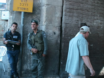 | Toni with an Israeli soldier out side the Dung Gate on Jerusalem's south side. Jenn and Ryan are in the background. |