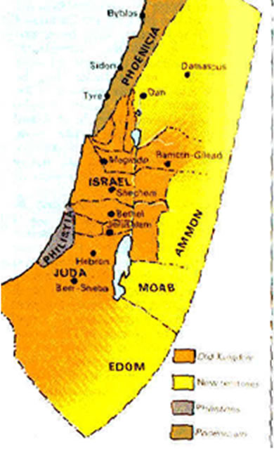 David decisively defeated the Philistines and eliminated them as a threat to Israel forever. The unconquered Canaanite cities such as Beth Shan, Megiddo and Dor were subdued. Politically David secured and expanded the borders of Israel to include the Moabites, Arameans, Edomites, and Ammonites. David established international relationships with Hiram, king of the Phoenicians.
