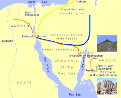 Moses is born to a Hebrew family in the year 1525 BC but raised in the palace of Pharaoh Thutmose II. The name Thutmose (also read as Thutmosis) means “Thoth is born”. It can easily be seen that Moses was called by his Egyptian family name “mose” through out his life. The name of the Egyptian’s most important deity, Thoth, is dropped from Moses’ name leaving him with the simple ending “mose” or “moses” which means fittingly “born”, “son” or “rightful heir.” Hatshepsut, the half-sister and wife of Thutmose II, would have been the royal princess who took Moses from the Nile. Moses is trained in all the wisdom of Egypt and becomes a great man among the Egyptians. At the age of forty Moses tries to free the Hebrews but has to flee across the desert into the land of Midian. After serving as a shepherd for forty years Moses is called by God to return to Egypt to get the people of Israel. God wants Moses led these men and their families to Mt. Sinai to receive instructions from God.