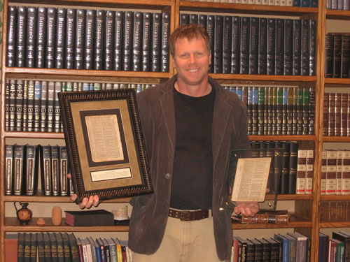 Galyn Wiemers with two pages from his Bible collection:
