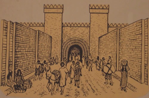 The gate of the city. The original mud bricks are dark. The reconstruction is the lighter bricks.