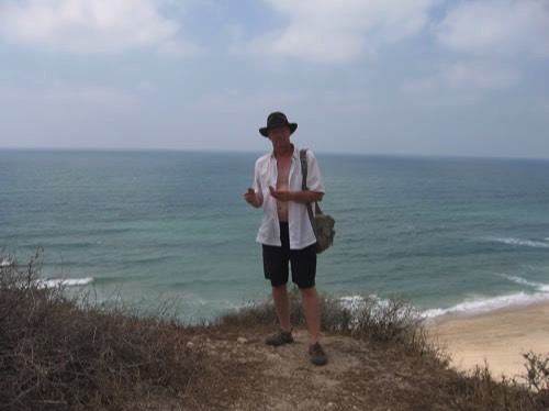 Galyn stands on the remains of Ashkelon with a couple of the potsherds he pick up among the ruins.