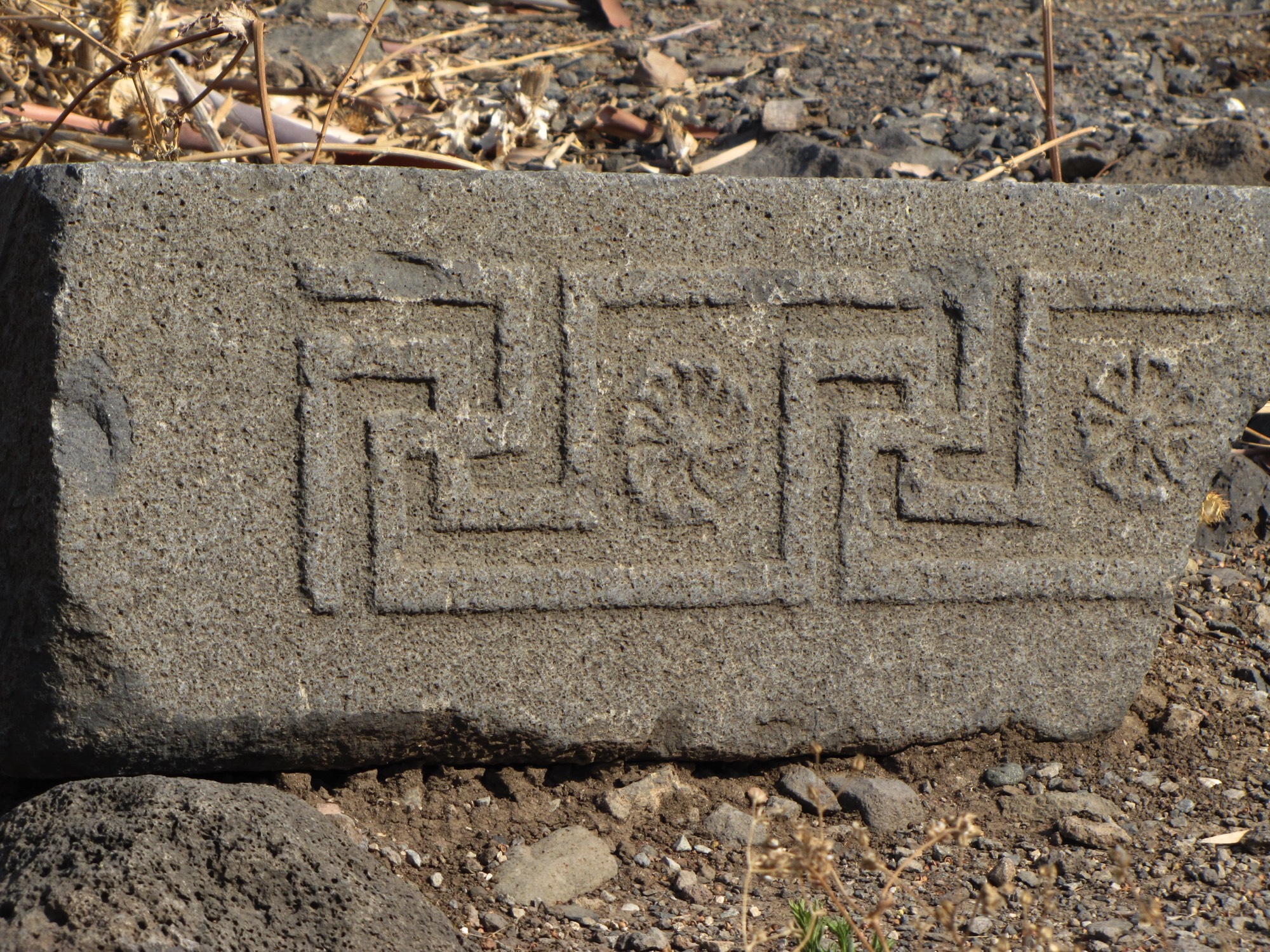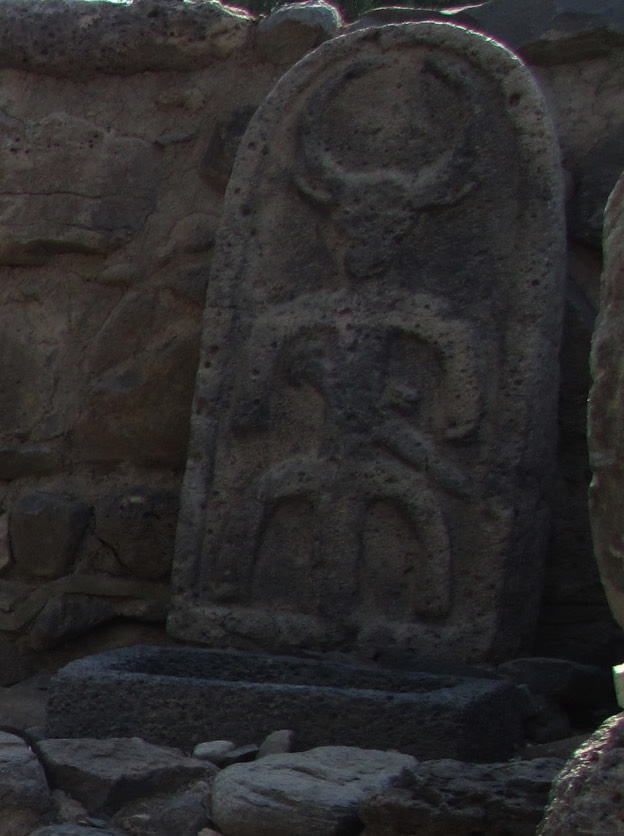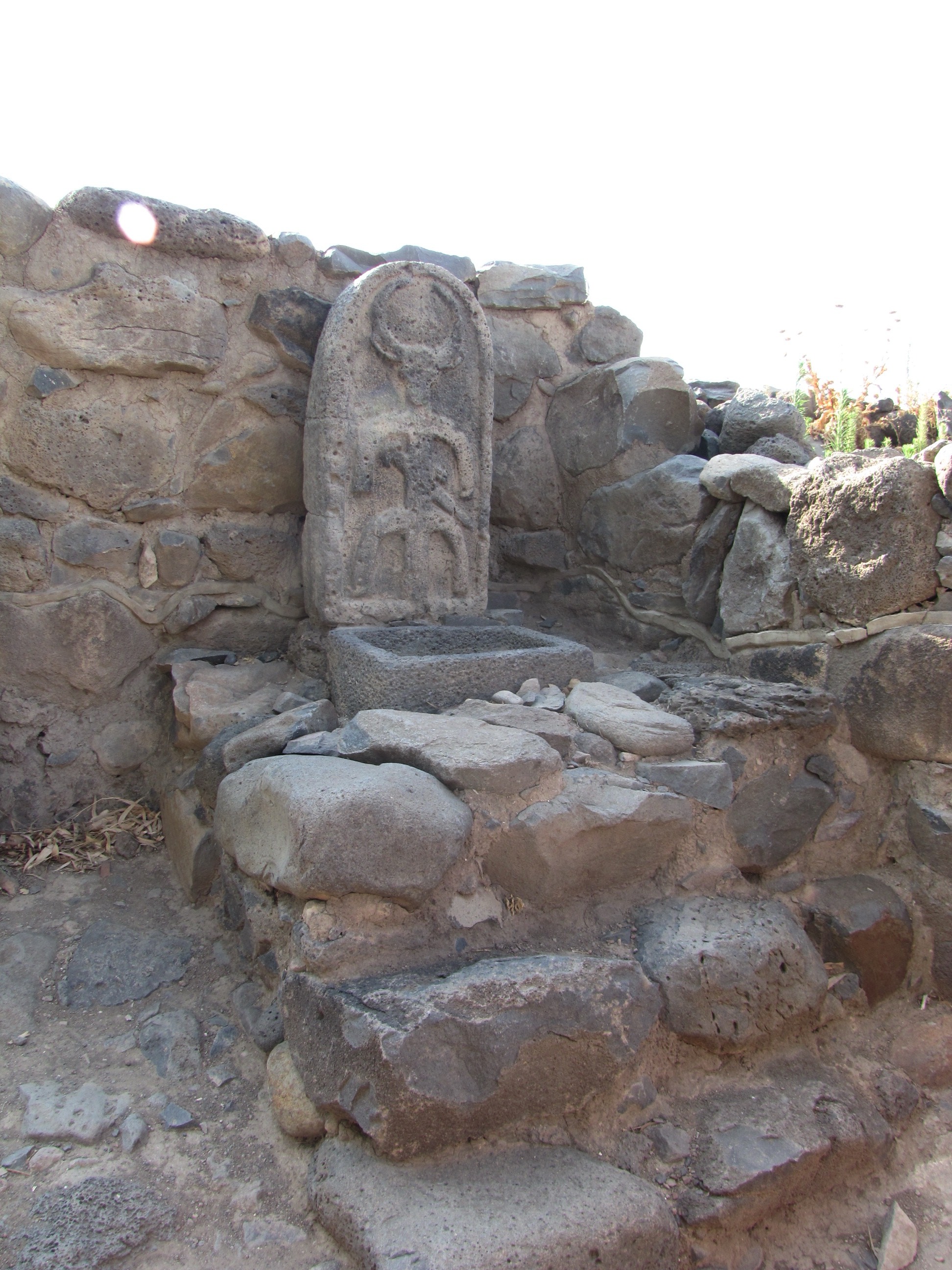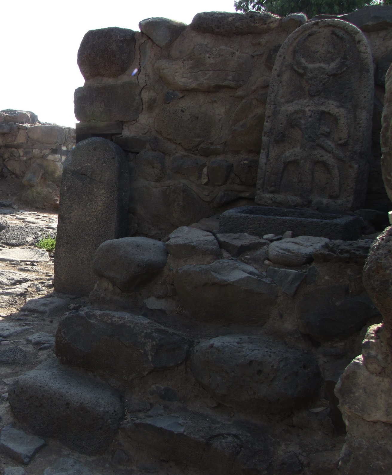 The right side of the gate has the high place of worship with three steps leading up to the stela and basin.