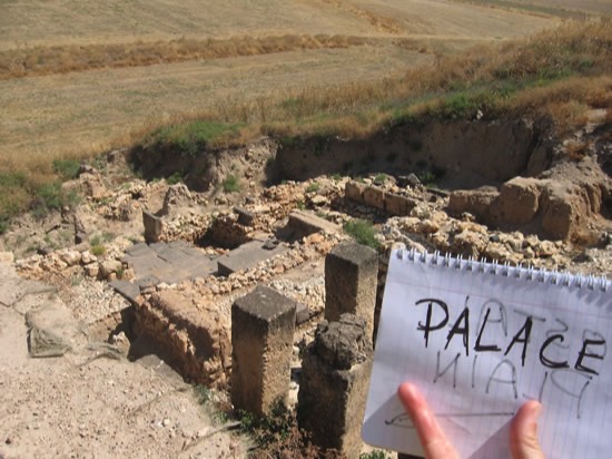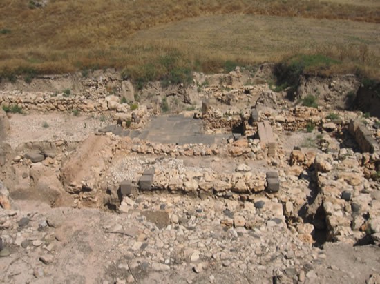 3) Canaanite Palace with courtyard platform, 2 bases for columns, main entrance, throne room with rooms on 3 sides all destroyed by intense fire of Joshua;